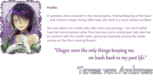 一位办公室女士将转世为特蕾莎·冯·安布罗斯,这原本是不起眼的乙女游戏《星星的永恒祝福》中一个没有灵魂的额外角色, 其中大多数结局都以阿斯莫迪亚王国这样或那样的混乱告终……
